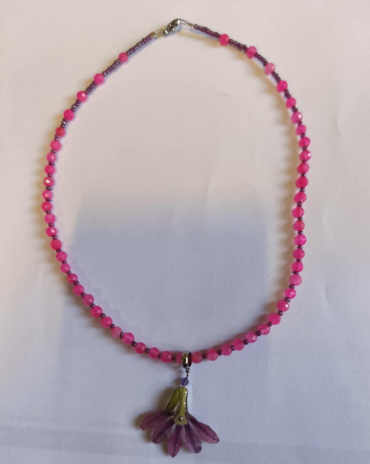 Ροζ σκεύολα, γυάλινες χάντρες, ατσάλινο κούμπωμα