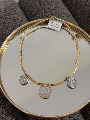 Kολιε Λευκή μαργαρίτα, ατσάλινη επιχρυσωμένη αλυσίδα με ημιπολύτιμες χάντρες jade multi