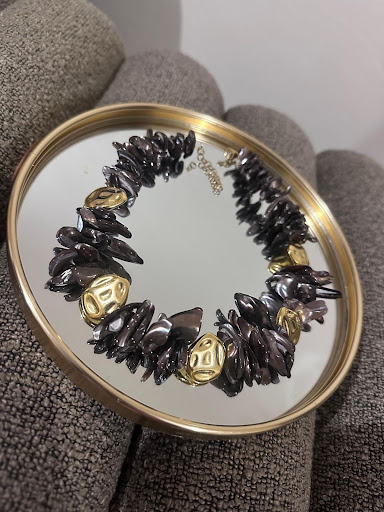 Κολιέ από ημιπολύτιμους λίθους και μεταλλικά ζαμακ περαστά στοιχεία σκαλιστά 24Κ επίχρυσα